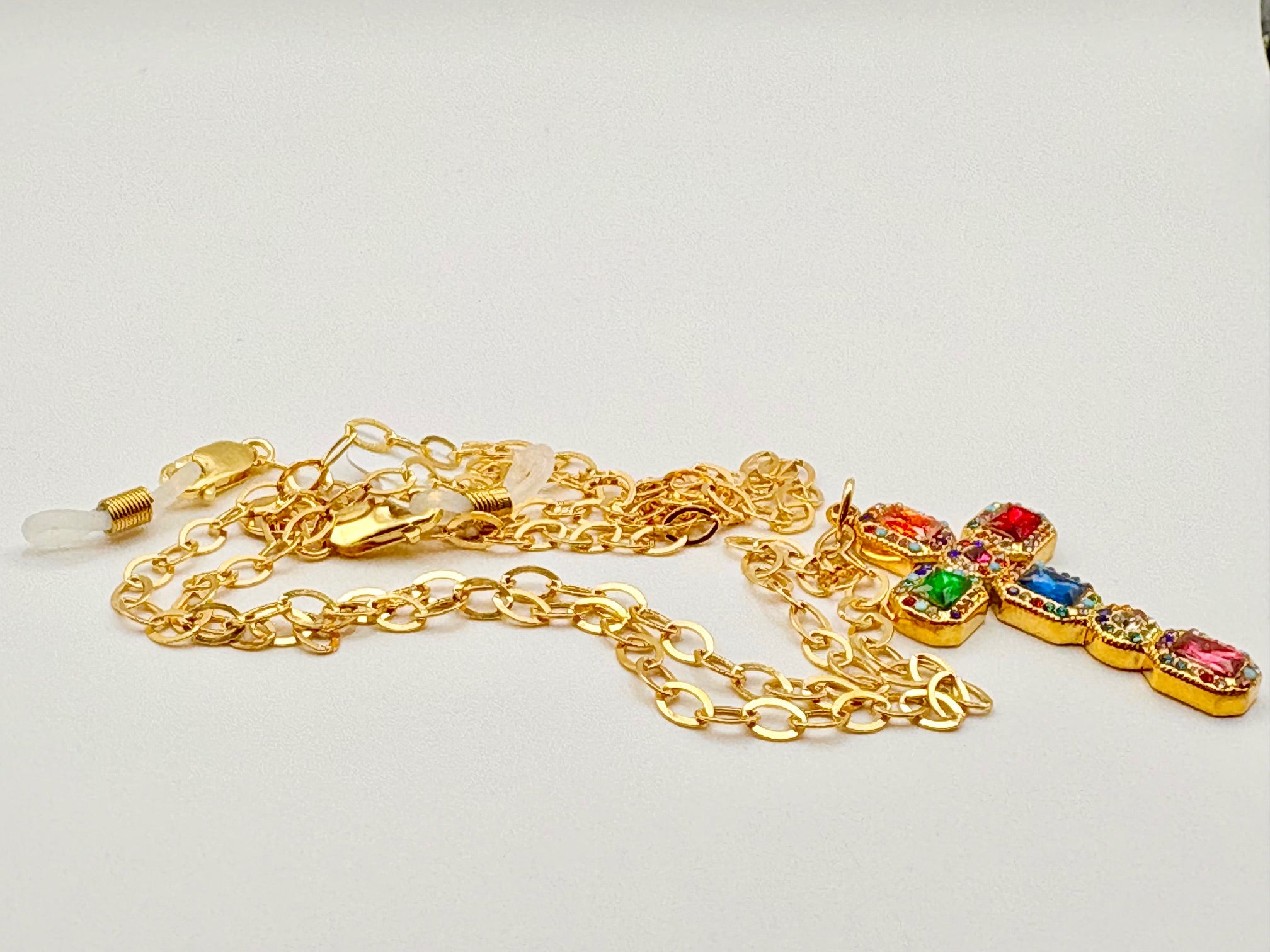 CHAINE PLAQUE OR AVEC CROIX MULTI-CRISTAUX