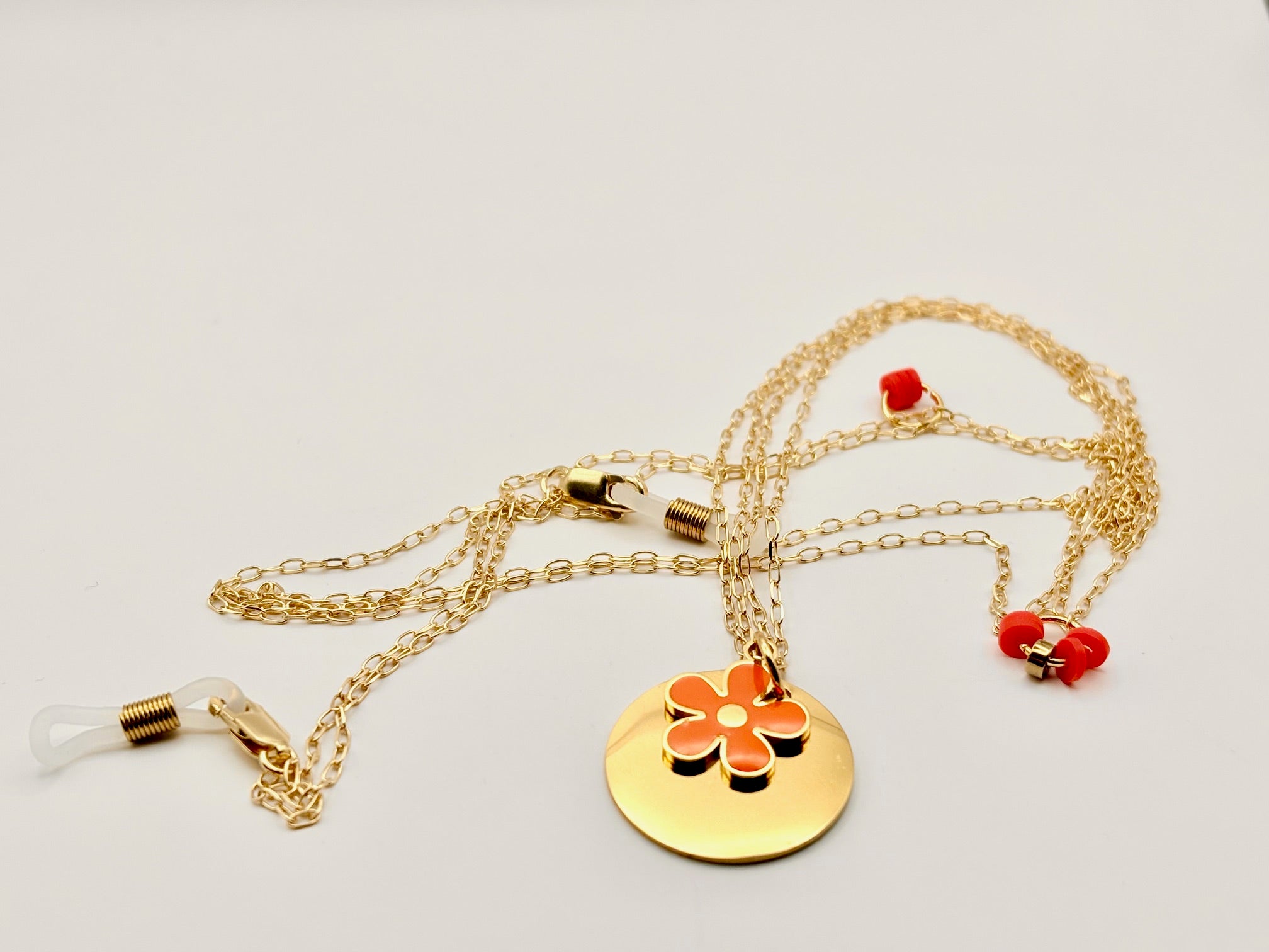 Votre bijou artisanal de 70 cm environ, est réalisé avec une chaîne et un fermoir en plaqué or ainsi que deux attaches en silicone. Un charm fleur de couleur orange orne votre chaîne